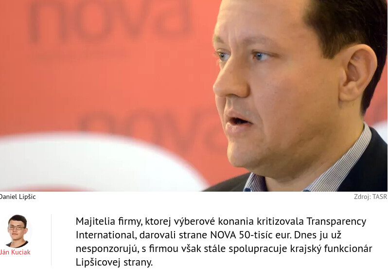 Majitelia firmy, ktorej výberové konania kritizovala Transparency International, darovali strane NOVA 50-tisíc eur. Dnes ju už nesponzorujú, s firmou však stále spolupracuje krajský funkcionár Lipšicovej strany.