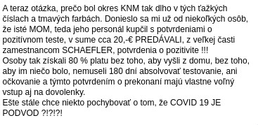 Kysučania si kupovali pozitivitu na COVID-19, aby ostali doma, dostali plat za nič nerobenie, mali potvrdenie o prekonaní na COVID-19.Čo z toho vyplýva? Reinfekcie sa vyskytnú, nie reálne. Rástli čísla, tvrdšie opatrenia len pre pár podvodníkov (ak boli nad 60 rátali sa ako 4 pozitívni).
