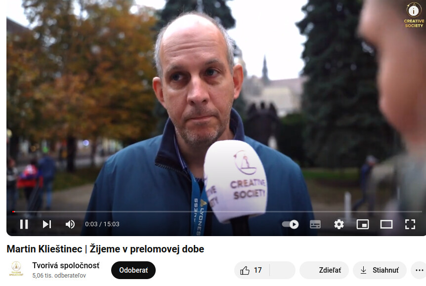 Na fotke vpravo vidieť Martina Klieštinca, to je taká podržtaška Jána Baránka. KLieštinec stál s liberálmi a Pčolinským pri riadených Gorila protestoch. Tu ho môžme vidieť na videu setky Tvorivá spoločnosť. Klieštinec opakovane nehovorí o Slovensku, ale o tejto krajine.