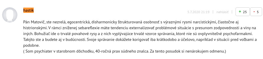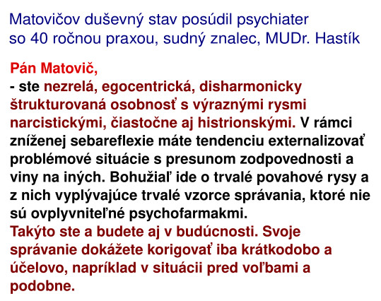 Podľa popisu ide o psychiatra s praxou niekoľko desiatok rokov, ktorý sa zaoberaj aj znaleckou činnosťou. Z jeho popisu je Matovič narcistická porucha osobnosti s histrionskými rysmi.