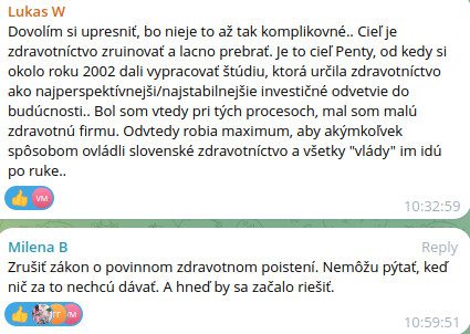 Peniaze sú, len podľa mňa je cieľ zruinovať zdravotníctvo, zdravotníkov vyhnať do zahraničia, pomaly tu navoziť lekárov z Ukrajiny a iných štátov, a tak vykonať obmenu obyvateľstva a rozbiť zázemie, rodiny.(Samozrejme aj Ukrajincom, lebo aj o ich krásnu krajinu a úrodnú pôdu má niekto záujem.) A na nemocnice, ambulancie si brúsia zuby už finančné skupiny a ich lokaji politici a tie finančné skupiny sú podľa mňa len biele kone nadnárodných korporácií, ktorých majitelia majú záujem o našu krásnu krajinu.