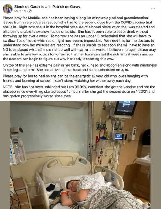 Maddie, 12 ročné dievča sa zúčastnilo testovania vakcíny na COVID-19 v Cincinnati, Ohio. Závažne ochorela 12 hodín po podani druhej dávky, ktorú dostala 20 januára 2021. Mesiace je hospitalizovaná, videli ju mnohí špecialisti, mala opakované magnetické rezonancie, endoskopie… Je ochrnutá od drieka dolu, nie je schopná udržať jedlo, za mesiac schudla 7 kg, tras končatín, 20x za deň stratu vedomia, problémy s močením, silnú bolesť, nie je schopná hýbať nohami.