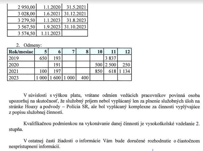 Administrátor stránky hoaxy a podvody polícia SR zarába cca 3700 eur + niektoré mesiace odmena 1600 EUR. To je cca 5000 EUR. Mená odmietli zverejniť. Osoby, ktoré na internete vystavujú pranieru osoby s iným názorom sa nechcú zverejniť. Nie je problem pre nich šikanovať, zastrašovať iných. Pritom chcú byť v tajnosti, ale financujeme ich my, z verejných financí.