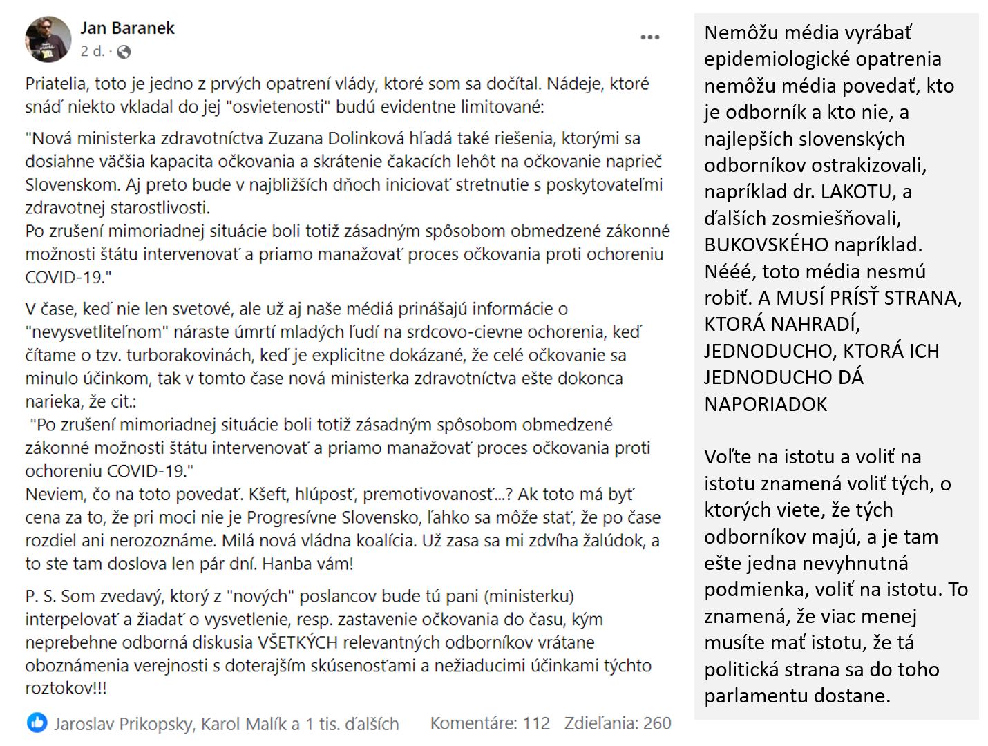 Je očividné, že podľa Baránka sú tými relevantnými odborníkmi, doc. Lakota a dr. Bukovský, ale aj ďalší, o ktorých je známe, že počas koronakrízy šírili nehorázne hoaxy. Takže, keby pán Baránek bol schopný aspoň trochu kriticky rozmýšľať, tak by mu malo byť jasné, že takáto odborná diskusia je vopred odsúdená na neúspech.
