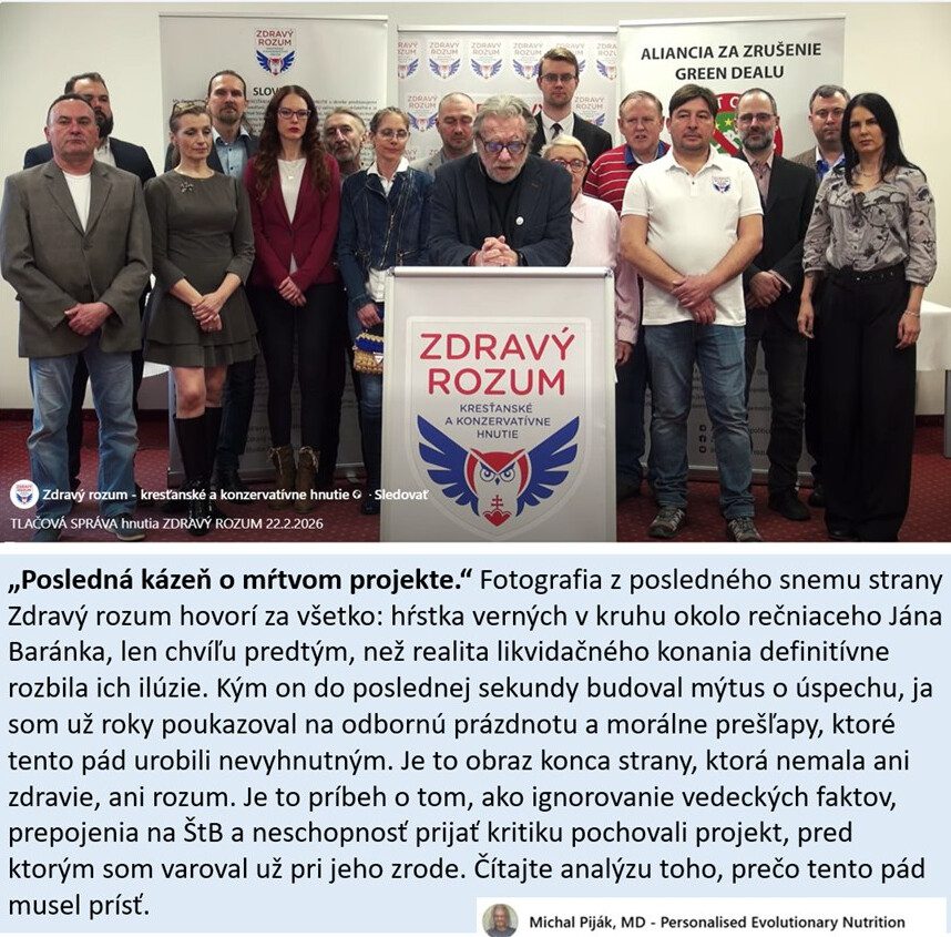 Moja kritika z rokov 2023 až 2026 nebola útokom na osobu, ale obranou integrity medicíny a zdravého úsudku. Prípad Baránek je mementom: pravda sa nedá dlhodobo nahrádzať marketingom. Strana, ktorá nemala ani zdravie, ani rozum, skončila presne tam, kde patrí – na smetisku politických dejín.