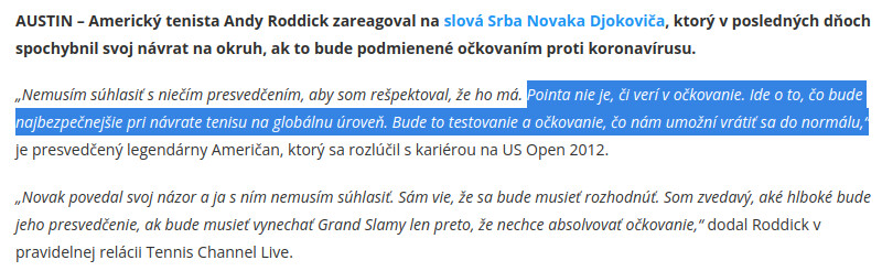 V apríli 2021 propagoval experimentálne očkovanie na COVID-19, hovoril, že to je logický krok, dať sa očkovať na COVID-19. Práve ATP a iné organizácie lobovali za očkovanie a neočkovaní nemohli hrať tenis.