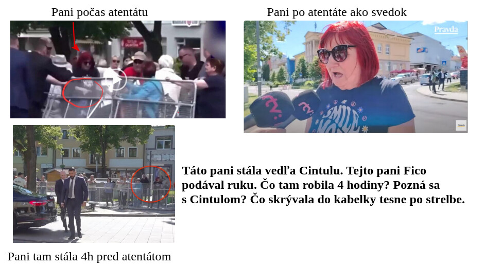 Páni v červenom, ktorá tam stála vyše 4 hodín, keď sa jej pýtali, či priamo videla ako sa to stalo, hovorí, že nebude hovoriť. Stála vedľa Cintulu, Fico jej podal ruku a po strelbe niečo dávala do kabelky. Presne pri nej bola na zemi pod zábradlim spadnutá pištoľ.