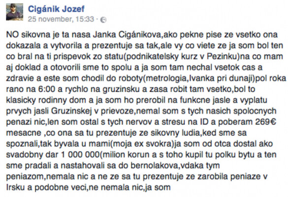 Na jej tvrdenia reagoval jej exmanžel Jozef Cigánik.