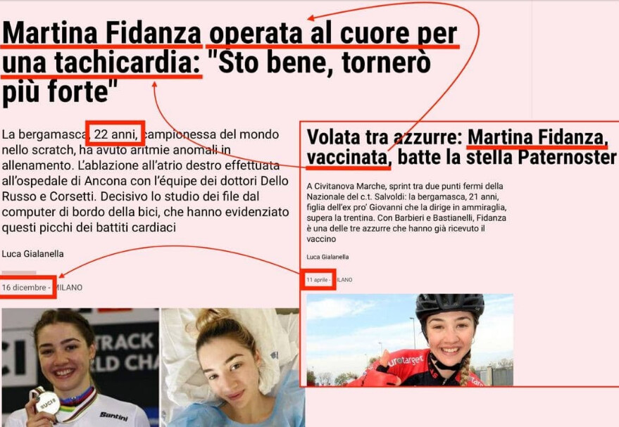 Športovkyňa-cyklistka podstúpila vakcináciu na COVID – uvedené v tlači 11.4.2021.16.12.2021 sa opať v tlači možeme dočítať,že musela podstúpit zákrok na srdci (rádiofrekvenčnú abláciu) pre zistenú arytmiu (anomália srdečnej akcie- može byť rýchla,nepravidelná,prídatný rytmus – extrasystoly).