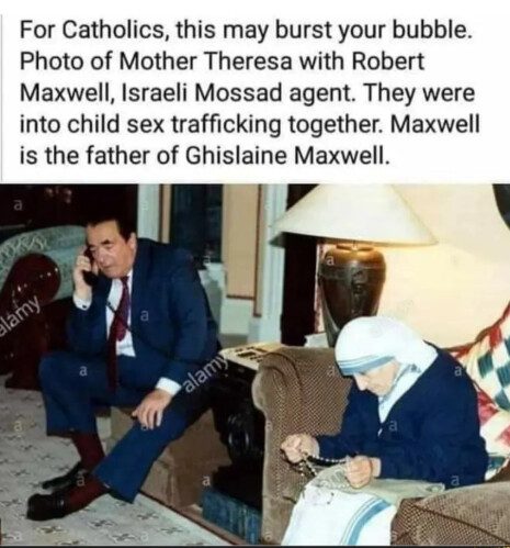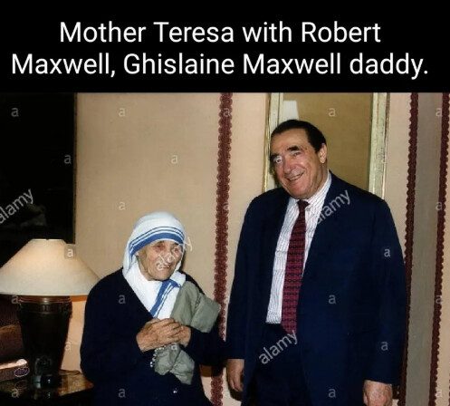 Robert Maxwell — otec Ghislaine Maxwell. Mediálny magnát. Spojený s Terezou cez vatikánske fundraisingové kanály. Jeho dcéra sa stala hlavnou náborárkou pre Epsteina. Tento diabol, ktorého pomätenci nazývajú matka Tereza patrí medzi najväčšich netvorov, aké ľudstvo poznalo. A tak to je. Vrahovia a psychopati ako Obama, Trump a iní získavajú Nobelové ceny miery. Pedofili ako Jimmy Saville majú prístup do detských domovov. Celé horé nohami. Ale môžu si to dovoliť ľudstvo je extrémne hlúpe a zdegenerované.Tu falošný pápež Jan Pavol 2 s netvorom Terezou. Tá podľa odborníkov na tvár má viac ako 95% znakov tváre mužských.A táto fotka prekvapí len pomäteného hlupáka. Kto chápe vie, prečo falošný pápež dáva rozhrešenie dvom pedofilom, vrahom a obchodníkom s deťmi – Epsteinovi a jeho pravej ruke Ghislaine Maxwell. Jej otec Maxwell Róbert bol agent Mosadu, vrah, sexuálny deviant a násilnik. Podľa niektorých tvrdení mal sexuálne zneužívať aj svoju dcéru Ghislaine Maxwell. Maxwell s matkou Terezou obchodoval s deťmi.