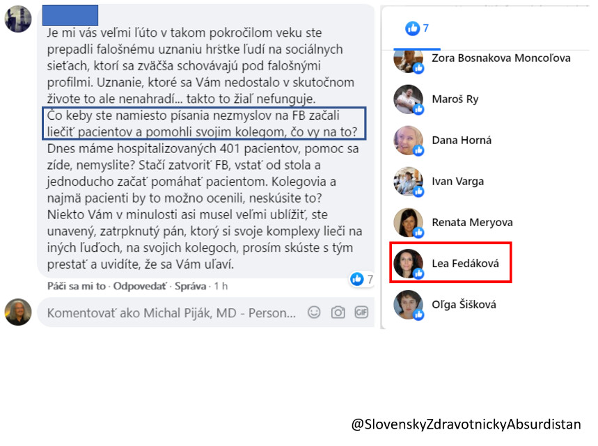 Je neuveriteľné, že tento posmešný komentár plný klamstiev lajkovala aj primárka kliniky, na ktorej pracujem, Lea Fedáková. Pripadá mi to tak, ako keby nemohla zniesť, že prednosta kliniky ma poveril, aby som robil odborný dohľad nad mladšími kolegami, ktorí pracujú na covidovom oddelení na I. internej klinike, kde pracujem, a aby som medikov, ktorí stážujú na klinike oboznamoval s problematikou COVID-19.