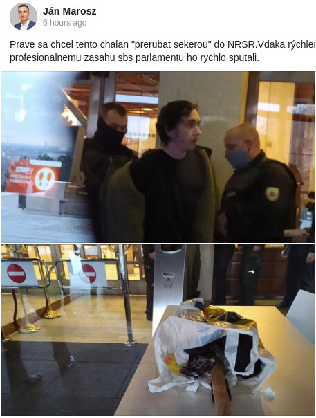 „Mali sme tu jeden útok, videl som to na zázname. Ten človek je spacifikovaný, už ho zobrali policajti. Chcel vtrhnúť do budovy, mal sekeru a bodák,“ priblížil Kollár. Dodal, že ochrankári stáli vonku a videli podozrivého človeka, ktorý pred vstupom do budovy vybral z tašky sekeru. „Okamžite zareagovali,“ povedal šéf parlamentu a poďakoval sa zamestnancom za ich prácu.