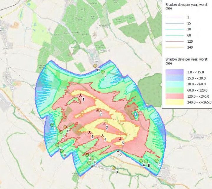 Jeden príklad zo str. 62 zo Správy o hodnotení firmy Envis s.r.o. z 10/2024 verejne dostupnej na enviroportal.sk. Obrázok ukazuje v originálnej kvalite “koľko dní v roku bude blikať tieň lopatiek v danom území pre daný variant riešenia.” V oblasti Močidľanských vinohradov, kde sa nedávno začali sťahovať mladé rodiny s ďeťmi by mali na prechádzkach vidieť blikanie tieňov z lopatiek až do 365 dní v roku (žltá farba), do 240 dní v roku v Popudinách, do 120 dní v roku v celej obci Popudinské Močidľany, Dubovciach, Mokrom Háji a v polovici Radošoviec.