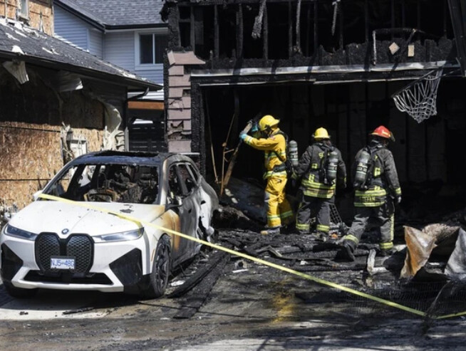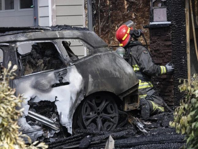 Dom susedov na pokojnej slepej ulici Cloverdale, 18000-block 66A Avenue, bol zrazu v plameňoch a horelo aj elektrické SUV na príjazdovej ceste.