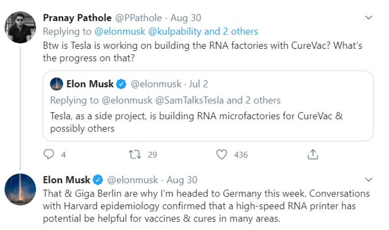 Musk opísal prenosné automatizované jednotky na výrobu mRNA ako „RNA mikrotovárne“, ktoré budú postavené v Tesla Grohmann Automation v Nemecku. Tesla získala miestnu inžiniersku spoločnosť Grohmann Automation v roku 2017.