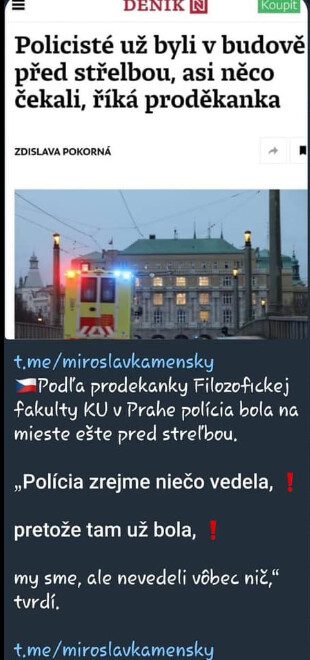5. Podľa šéfa galérie naproti miesta činu sa vrah vzdal polícii: Celý incident sledoval šéf Galerie Rudolfinum Petr Nedoma, která sídlí hned naproti Filozofické fakultě. „Viděl jsem na ochozu stát mladého člověka, který měl v rukou zbraň. Střílel opakovaně s určitými prodlevami, z nějaké zbraně, k Mánesovu mostu. Pak vystřelil, dal ruce nahoru a zbraň hodil na vozovku. Pak se začali objevovat patrně policisté na tom ochozu,“ řekl Blesku šéf galerie.