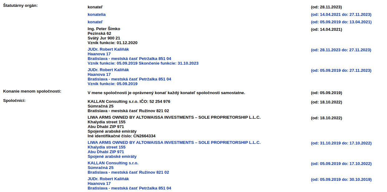 Jednou takou firmou, ktorej predmetom obchodnej činnosti je aj vývoj a výroba zbraní, je spoločnosť Liwa Arms Slovakia s.r.o. A jedným z jej vlastníkov je minister obrany, Robert Kaliňák. Podľa údajov v obchodnom registri SR bol v tejto spoločnosti ešte do 23. novembra 2023 aj jej konateľom. Spoločnosť sídli v areáli zbrojovky v Dubnici nad Váhom a jej spoločníkom je firma Kallan Consulting s.r.o. so sídlom na Súmračnej v Bratislave (sídlo strany Smer), ktorú tiež sčasti vlastní R. Kaliňák.