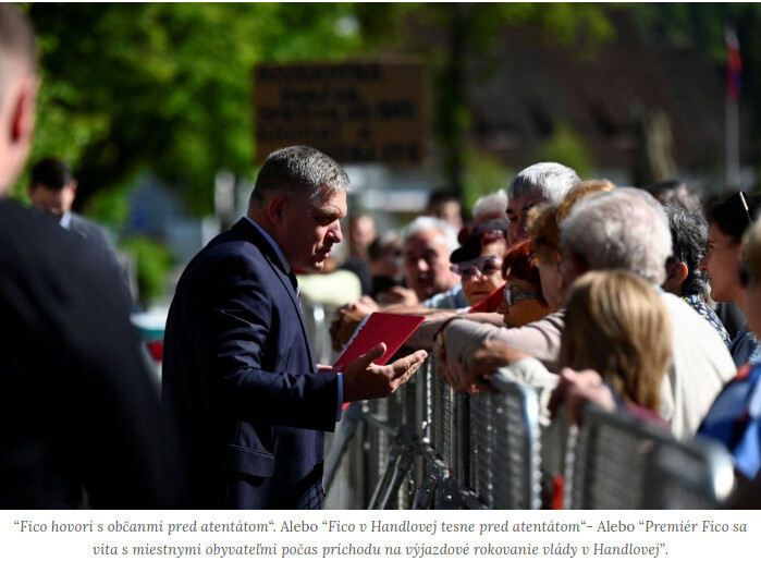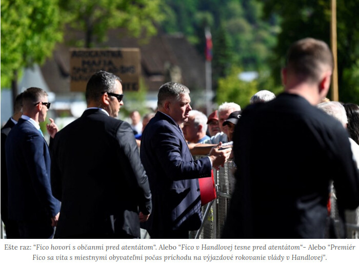 Pozrime sa z tohoto pohľadu na nasledujúcu fotografiu, označenú ako “Fico hovorí s občanmi pred atentátom” (Reuters, Vjesti) resp. “Fico v Handlovej tesne pred atentátom, foto: TASR” v Hlavnom denníku, “Premiér Fico sa víta s miestnymi obyvateľmi počas príchodu na výjazdové rokovanie vlády v Handlovej. Zdroj: TASR – Radovan Stoklasa”. v tvnoviny.sk. V posledne menovanom sa popis obrázku už líši od prvých dvoch, ale k tomu neskôr.