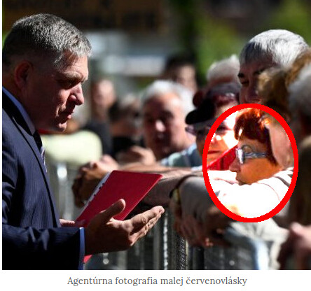 Červenovlasá žena sa na tejto fotografii nachádza presne oproti R. Ficovi – teda rovnako ako na videu, Ostatné osoby v zábere sú veľmi pravdepodobne iné. Nenašiel som ďalšie zhody. Možno vy. V každom prípade – je na tom istom mieste ako o niekoľko hodín neskôr na videu.