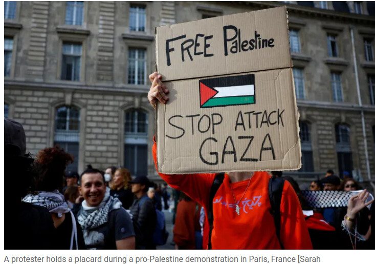 Protestujúci kričali, že Izrael sú vrahovia a Macron je ich komplic. Macron predtým odsúdil útok Hamasu a vyjadril solidaritu a podporu Izraelu. Protestujúci kritizujú zákaz protestovať, ktorý je základným právom v demokracii. Vo Francúzsku stúpajú útoky na Židov.