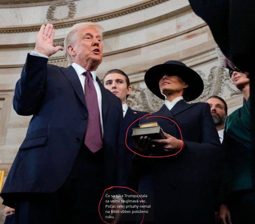 Tu môžeme vidieť, ako komediant a hlavne zločinec Trump neprisahá na Bibliu. Počas celej prísahy nemal na Biblii vôbec položenú ruku. Jeho zať je popredný predstaviteľ židovského prúdu Chabad Lubavich a jeho dcéra na židovskú vieru konvertovala.