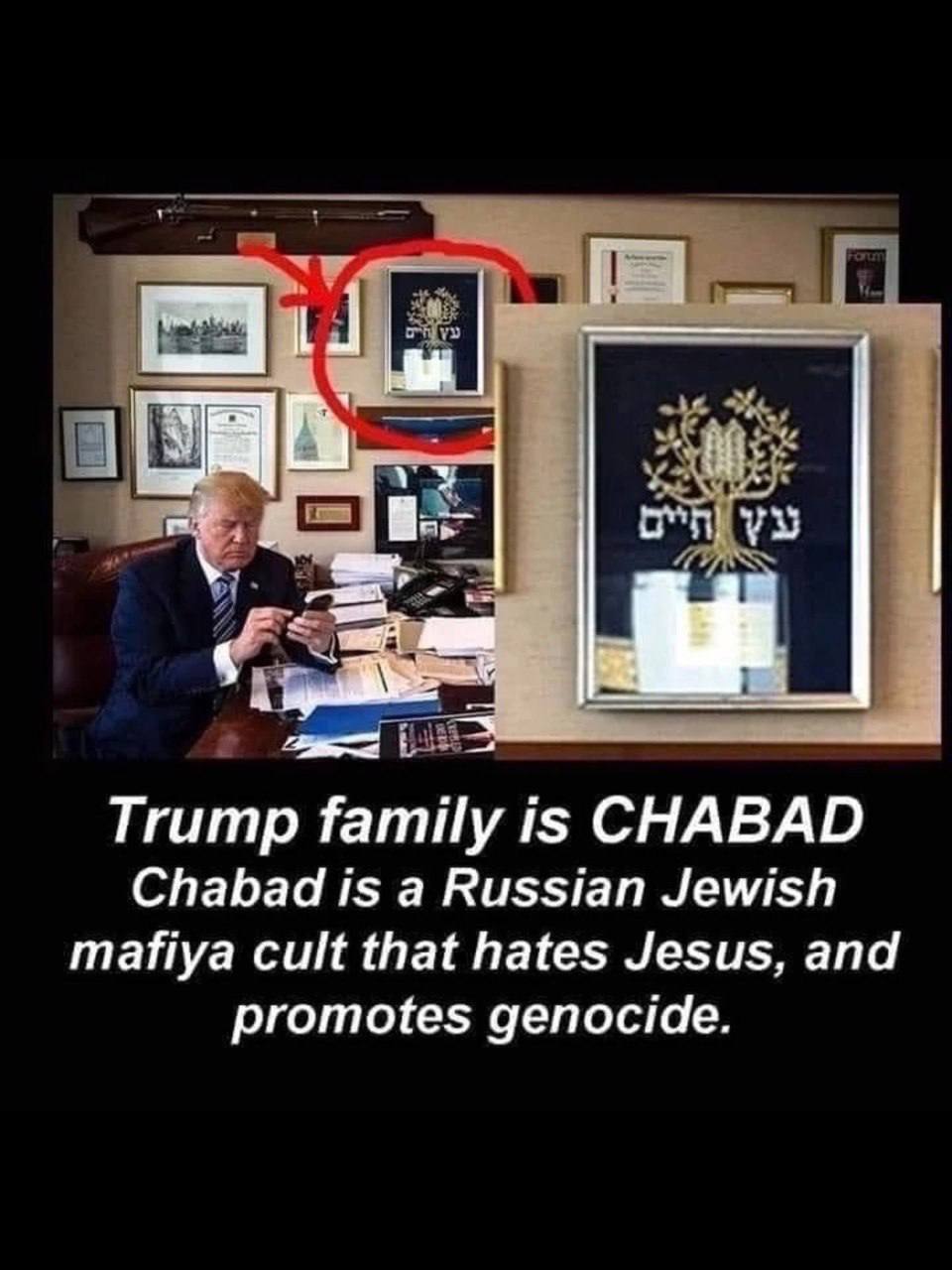 Trumpova rodina sú zo skupiny Chabad a Trump si ich symbol ponecháva v kancelárii. Chabad neznáša kresťanstvo a Ježiša Krista.