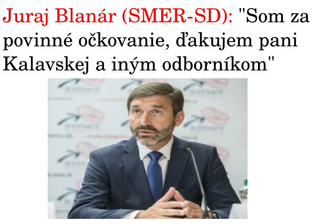 ĽSNS chcela za vlády Róberta Fica zmeniť povinné očkovanie na dobrovoľné, SMER-SD bol jednohlasne proti. Juraj Blanár sa zastal Kalavskej a podporil jasne povinné očkovanie. Netreba zabúdať, že manžel smeráckej ministerky zdravotníctva Kalavský pracoval na vysokej funkcii dlho pre Pfizer. Kalavská získala podvodne titul u Krčmerýho, ktorého univerzitu tiež financoval Pfizer. Krčmerýho sestra roky pracuje ako riaditeľka vo Pfizer v divizii vakcín.. Krčméry bol veľmi blízky priateľ Kalavskej a jej manžela.