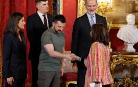 Zelenský podáva ruku ministerke obrany Španielska – Margarite Robles, s ktorou dohodol Kaliňák pobyt stoviek španielských vojakov na Slovensku.