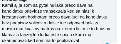 Za ďalšie: Keď politická strana niečo prezentuje, vábi ľudí k voľbám sľubmi a neviem čo ešte, tak to musí byť v stanovách a nie kde si na sociálnych sieťach!! Keď kápo Huliak tvrdí verejnosti, že je proti lgbt, proti gender a podobne, tak potom prečo je predsedom Prievidze strany NK/NEKA transsexuál? Je to farizejstvo, volebný podvod?? Upozorňujem, že to nie je narážka na toho predsedu Prievidze, ale z politickej stránky!!
