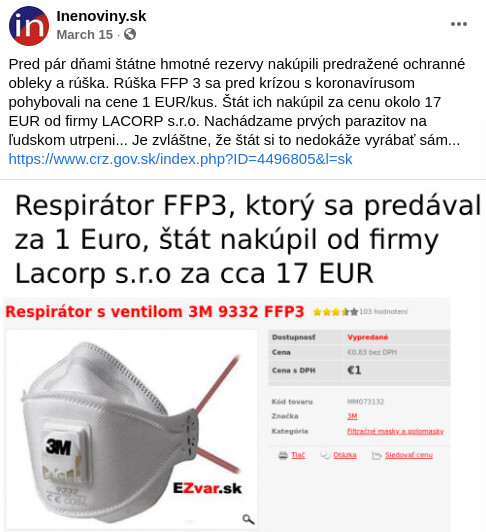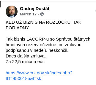 Predražený nákup od firmy Lacorp štátnymi hmotnými rezervami pod vedením Kajetána Kičuru sme zverejnili na našej FB stránke 15.3.2020.