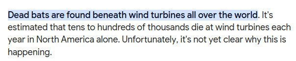 V okolí veterných turbín sa nachádzajú tisíce mŕtvych netopierov. Doteraz nie je jasné, prečo. Môže ísť o nebezpečný zvuk alebo vibrovanie, ktoré zabíja zvieratá. Preto je na mieste obava o ľudské zdravie. Práve netopiere majú s ľuďmi DNA zhodnú na 97%. Netopiere sa dožívajú kratšie, efekt turbín na ich žitie môže byť rýchlejší ako u človeka. U človeka sa takéto záhadné úmrtia môžu vyskytovať po pár rokoch, nájsť súvis s turbínami bude však podstatne náročnejšie.