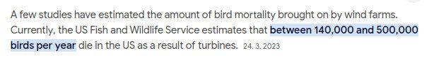 Podľa analýz sa odhaduje, že veterné turbíny zabíjajú do 500 000 vtákov ročne. Ochranári zvierat hovoria, že čísla sú podstatne vyššie a vidia to ako cieľ vyzabíjať prospešné zvieratá, aby sa premnožil hmyz škodlivý pre poľnohospodárov. Je pozoruhodné, ako tu vidieť súvis s tým, ako chcú ľudí obrať o poľnohospodárstvo a pestovanie plodín. Firmy predávajúce insekticídy zarobia a zarobia aj farma firmy, lebo rakovín bude znova viac…z postrekov a toxickej chémie.
