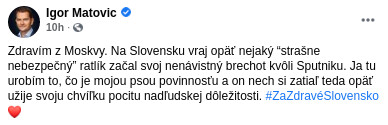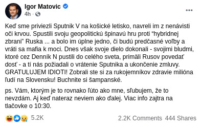 Matovič dnes bol v Moskve riešiť vakcínu sputnik V. Uverejnil zahmlené statusy, poukazujúce na niekoho, kto voči Matovičovym aktivitám brojí a kto Matoviča vytáča, nazval ho ratlíkom.