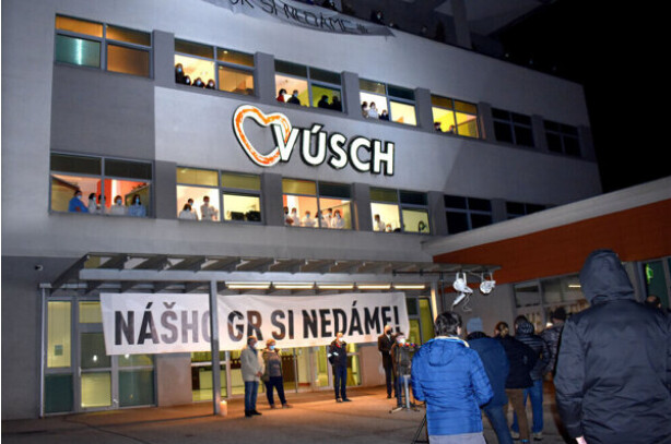 KOŠICE. V oknách košického kardioústavu desiatky zamestnancov a nad vchodom roztiahnutý veľký transparent „Nášho GR si nedáme“.