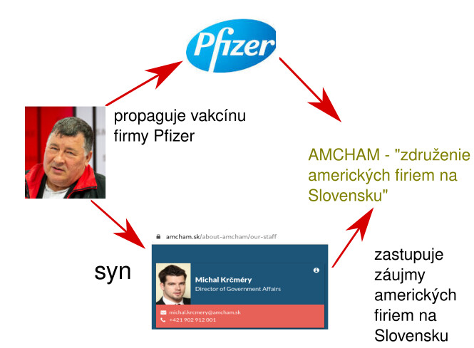 Jeho otec je hlavným propagátorom očkovania vakcínou od americkej firmy Pfizer. Bol prvým Slovákom, ktorý sa dal touto vakcínou očkovať. I keď mnohí ľudia mu neveria a hovoria, že sa dal očkovať placebom alebo vitamínmi. Jeho syn zastupuje záujmy amerických firiem a otec za pomoci médií robi tejto firme s veľmi pochybnou minulosťou reklamu za účasti väčšiny médií. O nezaujatosti v tomto prípade nemôže byť ani reč, zaujímavé, že média o tom mlčia. Ide o výrazný konflikt záujmov.