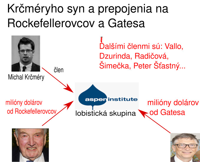 Krčméryho syn je nielen v americkej obchodnej komore, ktorá tu presadzuje záujmy amerických firiem a teda aj Pfizeru. Je aj členom Aspenu, čo je inštitút, ktorý financujú miliónmi Rockefeller, Gates. Ako inak združuje politikov, ľudí v médiach, vo verejnom priestor. Hodnoty sú spoločne: propagácia rodovej rovnosti, LGBTI, imigrácie, boj proti otepľovaniu a najnovšie propagácia testovania na COVID a očkovania.