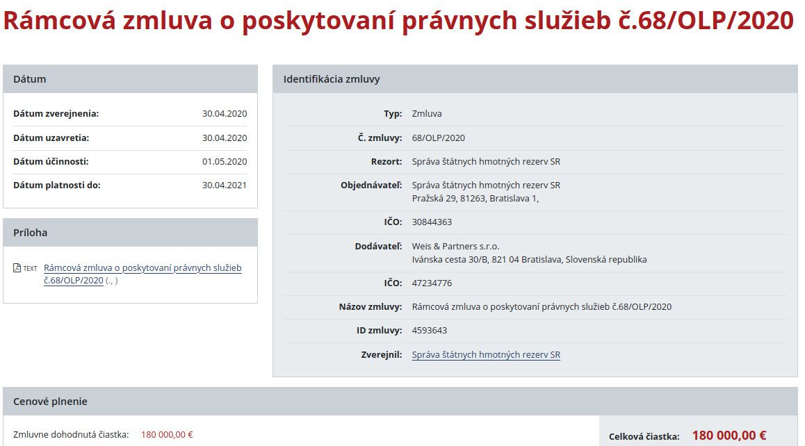 Počas Matovičovej vlády bola jeho firma vybratá na poskytovanie právnych služieb pre štátne hmotné rezervy. Práve tie, ktoré zabezpečovali nákup testov, masiek a iného materiálu používaného počas COVID-19. Weis sa mal vyjadriť, že zmluvu predčasne ukončil, nič také však sa nepíše na centrálnom registri.