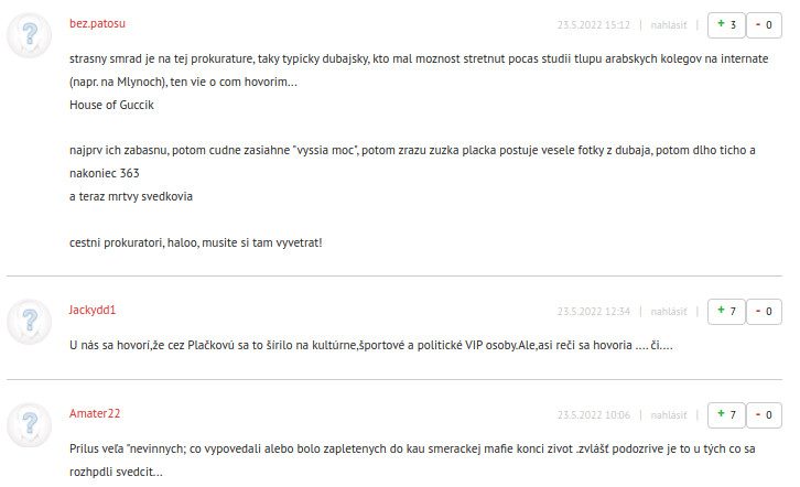 Množstvo ľudí sa vyjadrilo k jeho smrti a opisovali ho ako dobrého, charizmatického človeka. Toto sa nedá povedať o Plačkovej. Tento prípad je ďalším prípadom zlyhania slovenskej polície, kedy takéhoto kľučového svedka prepustili na slobodu a tam je otázne, či spáchal samovraždu, alebo bol zabitý.
