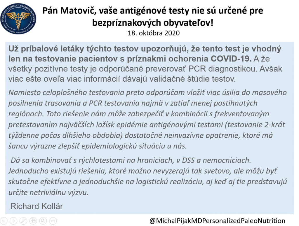 Ja len dodávam, že podobný postup sa použil v Číne a v najúspešnejších krajinách v boji s koronavírusom, ako je Island a Nový Zéland. Tam však sústredili na testovanie rizikových skupín a červených lokalít a použili PCR testy. Každý človek, ktorý je aspoň trochu schopný používať kritické myslenie, sa musí chytať za hlavu nad šialeným nápadom Matoviča a jeho nohsledov. Žiaľ, teraz sa jasne ukázalo, že takmer celá vláda má s tým problém, dokonca aj pán Sulík, ktorý sa považuje za veľkého pragmatika. Všetko zle je na niečo dobré, a dúfam, že toto bude posledný klinec do rakvy tejto vlády. Link na celý článok Richarda Kollára: Richard Kollára: