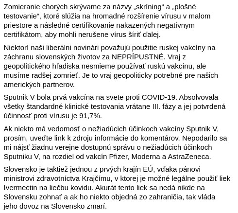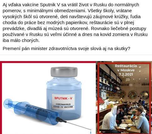 A ešte k článku pána Čarnogurského. To, že v Rusku je všetko otvorené nesúvisi vôbec s očkovanim, ale s mentalitou Ruska…tí nikdy nebudú rešpektovať nariadenia, tak ako my. Nariadenia tam sú, len ľudia ich ignorujú… zaujímalo by ma, či za takéto články dostal pán Čarnogurský aj zaplatené…..keby radšej pomáhal právne ľuďom a nemiešal sa do farma lobby…
