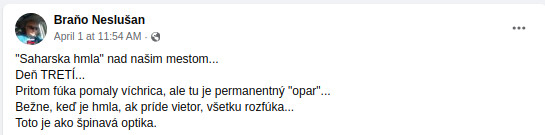 Je to zvláštne, prečo sa „saharský piesok“ vyskytuje hlavne keď začínajú stromy tvoriť kvety a opeľovať sa. V čase, keď ľudia začinajú sadiť, pestovať. Včelárom uhynulo viacero pomerne veľa včelich rojov. Robí si SHMÚ svoju prácu? alebo kto to má na starosti? Aké kovy sú v tom údajnom piesku.