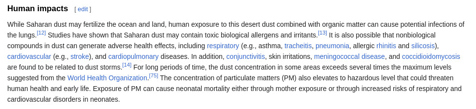 Podľa wikipédie saharský prach obsahuje Fosfor, hliník a mnohé prvky, ktoré môžu poškodzovať mozog a prispievať k demencii a psychickým poruchám.