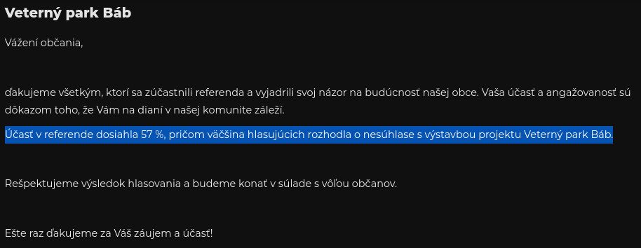 Referendum v obci Báb proti alebo za veterné elektrárne dopadlo proti. Ľudia väčšinovo odmietli veterné elektrárne. Napriek masívnej kampani súkromnej firmy, ale aj starostky a mnohých poslancov, ktorí lobovali za tieto elektrárne. Ľudia ich odmietli.