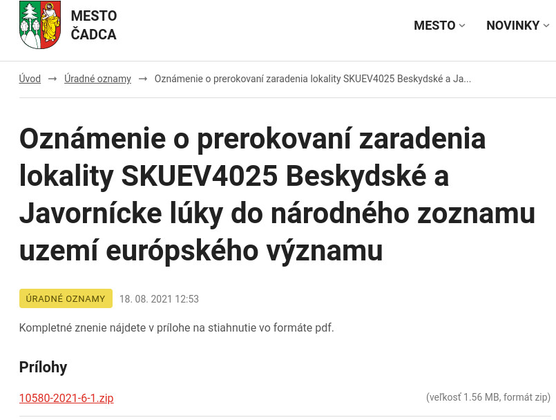 Týmto Vám oznamujeme, že dňa 13. septembra 2021 a dňa 14. septembra 2021 sa, v súlade s § 27 ods. 3 zákona č. 543/2002 Z. z. o ochrane prírody a krajiny v znení neskorších predpisov, uskutoční prerokovanie zaradenia navrhovaného územia európskeho významu SKUEV4025 Beskydské a Javornícke lúky do národného zoznamu území európskeho významu s vlastníkmi, správcami, nájomcami pozemkov dotknutých zamýšľanou ochranou. Predmetom ochrany v SKUEV4025 Beskydské