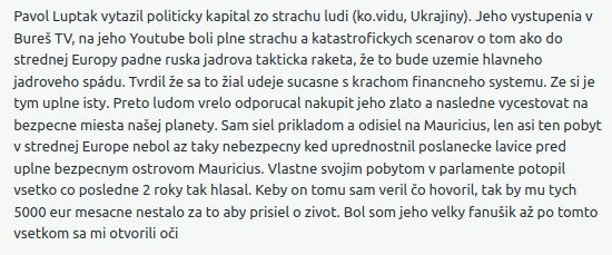Kto prišiel do kontaktu s Ľuptákom vie, že ide o extremného manipulanta. Typický predajca hrncov, akurát predáva zlato, diamanty a iné. Aby našiel obete vie, že ich musí dobre vystrašiť a túto taktiku naplno využíval vo svojich videách. Strašením ohlúpol toľko ľudí až ho zvolili do parlamentu. Manipulant, ktorý nemá ani jedno meno a figuruje vo viacerých verejných zdrojoch pod rôzným menom, buď Pavel alebo Pavol. Dlhé roky žil v Turčianských Tepliciach, po rozvode odišiel, napriek tomu, jeho firmy tam figurujú.