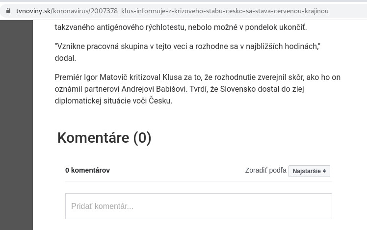 Cenzúra a mazanie nepohodlných názorov sa stáva bežnou súčasťou „novodobej demokracie“. Článok o tom, že sa sprísnia opatrenia voči šíreniu koronavírusu a uzatvoria hranice pre niektorých ľudí s Českom vyvolal v komentároch kritiku vlády. Všetky komentáre kritizovali toto rozhodnutie. Keď som si po pár hodinách pozrel komentáre, už tam neboli a svieti tam nula.