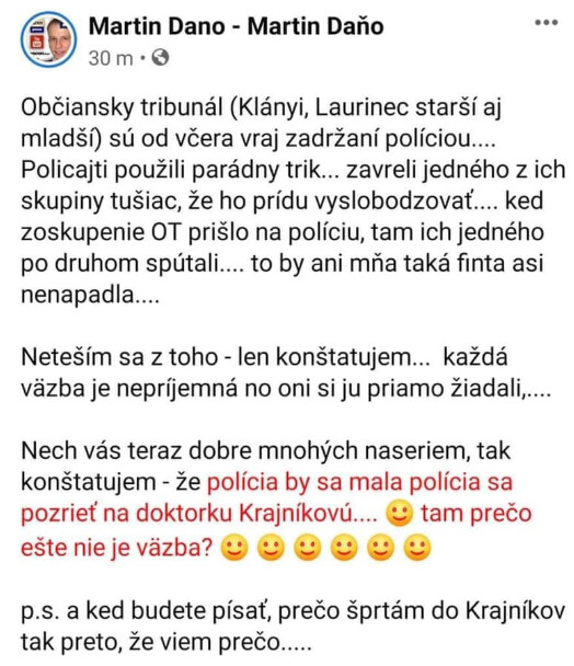 Toto Daňove konštatovanie je zaujímavé. Obzvlášť ak sa hovorí, že Dr. Krajníková je osoba blízka Štefanovi Harabinovi a má politické ambície. Štefana Harabina oživil pre alternatívu práve Martin Daňo. Ešte pre pochopenie textu je dôležité pochopiť nenávisť Daňa voči Občianskému Tribunálu, ktorý aj pred domom Daňa robil protest.