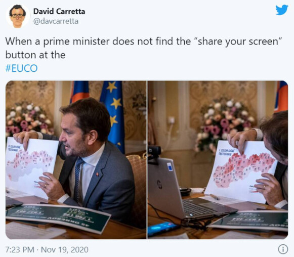“Keď premiér nevie nájsť tlačidlo zdieľanie obrazovky,” napísal talianský novinár David Carretta k fotografii Matoviča zo spomínaného videosummitu. Namiesto toho aby grafy prezentoval priamo so svojho notebooku pomocou funkcie “zdieľanie obrazovky”, ktoré je dostupné snáď už v každom programe pre videohovory. Náš premiér to zobral “oldschool” cestou a grafy ukazoval pomocou fyzických grafov, ktoré držal v ruke.