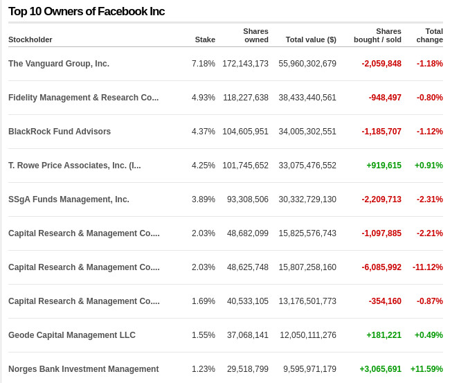 Ako vidíme tak Facebook vlastnia tí istí najväčši vlastníci ako farma firmy – BlackRock, Vanguard, Fidelity.