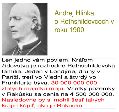 Prepis obrázka, kde sa vyjadruje Hlinka o Rothschildovcoch: Len jedno vám poviem. Kráľom židovstva je rozhodne Rothschildovská família. Jeden v Londýne, druhý v Paríži, tretí vo Viedni a štvrdý vo Frankfurte býva. 30 000 000 000 zlatých majetku majú. Všetky pozemky v Rakúsku sa cenia na 4 500 000 000. Nasledovne by si mohli šesť takých krajín kúpiť, ako je Rakúsko.